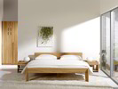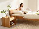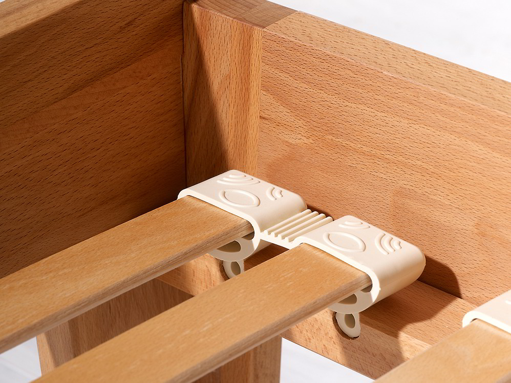 Das Bett ist mit einem integrierten, hochwertigen, flexiblen, metallfreien Lattenrost ausgestattet. Buchenfederleisten lagern einzeln in Halterungen aus dauerelastischem Kautschuk. Aufgrund dieser „Einzelaufhängung“ passt sich der Lattenrost an die Körperkonturen (Becken, Schulter) gut an. Überdies lässt sich die Festigkeit des Lattenrostes mit Baumwollschlaufen auf die individuellen Liegebedürfnisse einstellen.Möbeldesigner: Stefan Radner, Designbüro Gmunden