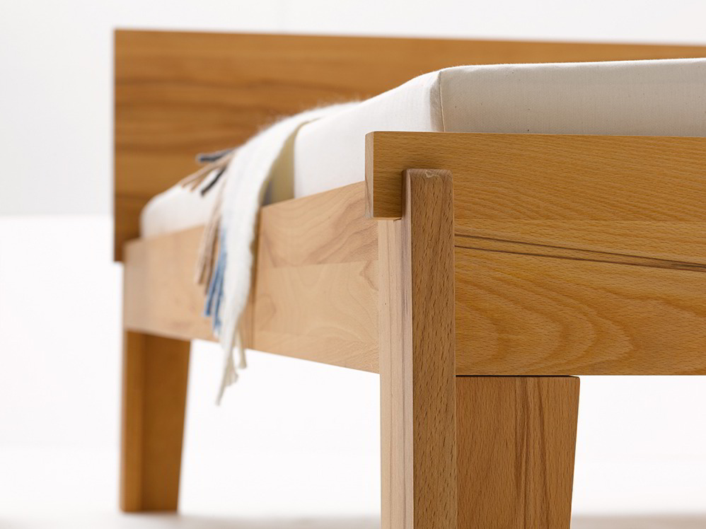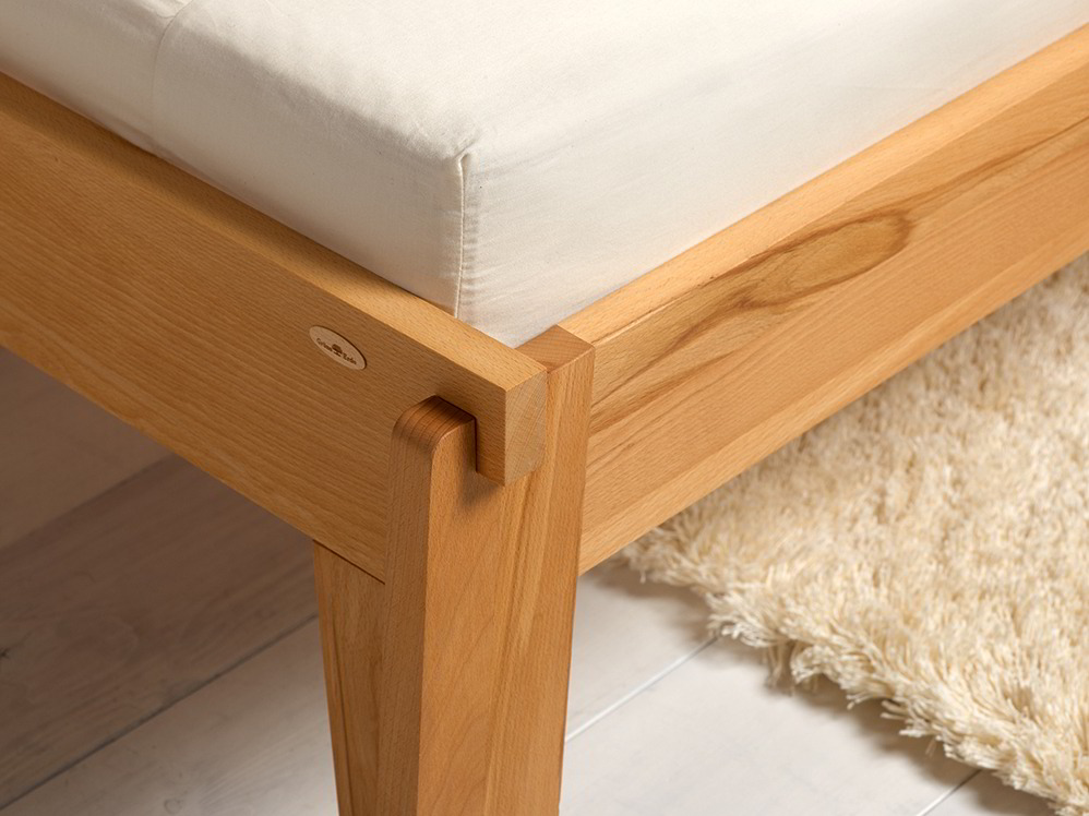 Das Bett Stefano wird in unserer slowenischen Partnerwerkstätte aus mitteleuropäischem Vollholz sorgfältig gefertigt – in Buche, Kernbuche oder Eiche, Holzstärke jeweils 25 mm. Fuß- und Kopfteil des Bettes werden mit den Seitenteilen über gut bedachte, passgenaue und fest sitzende, aber bei Bedarf wieder lösbare Dübelsteckverbindungen zusammengefügt: elementar einfache Konstruktionen, die ohne Metallteile auskommen.