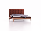 Die Holzteile des Bettes werden aus Eichen- und Buchenmassivholz in unserer Kärntner Tischlerei präzise gefertigt und naturgeölt. Die Vorgaben des Designs in Bezug auf Form und Anmutung des Bettes sowie eine zweijährige Produktentwicklung mündeten in viele optisch attraktive, gleichzeitig funktionelle handwerkliche Details. Etwa aufwendig gefräste, aus mehreren Einzelteilen zusammengesetzte Bettfüße; metallfreie Holzsteckverbindungen; von eleganten, linearen Fugen gekennzeichnete Übergänge zwischen Polsterung und blankem Holz. Oder die Möglichkeit, durch genial einfache Holzteile jede Matratze einzeln der Höhe nach zu verstellen (im Bereich von 3, 4, 5, 6 cm).Polsterung und Bezug