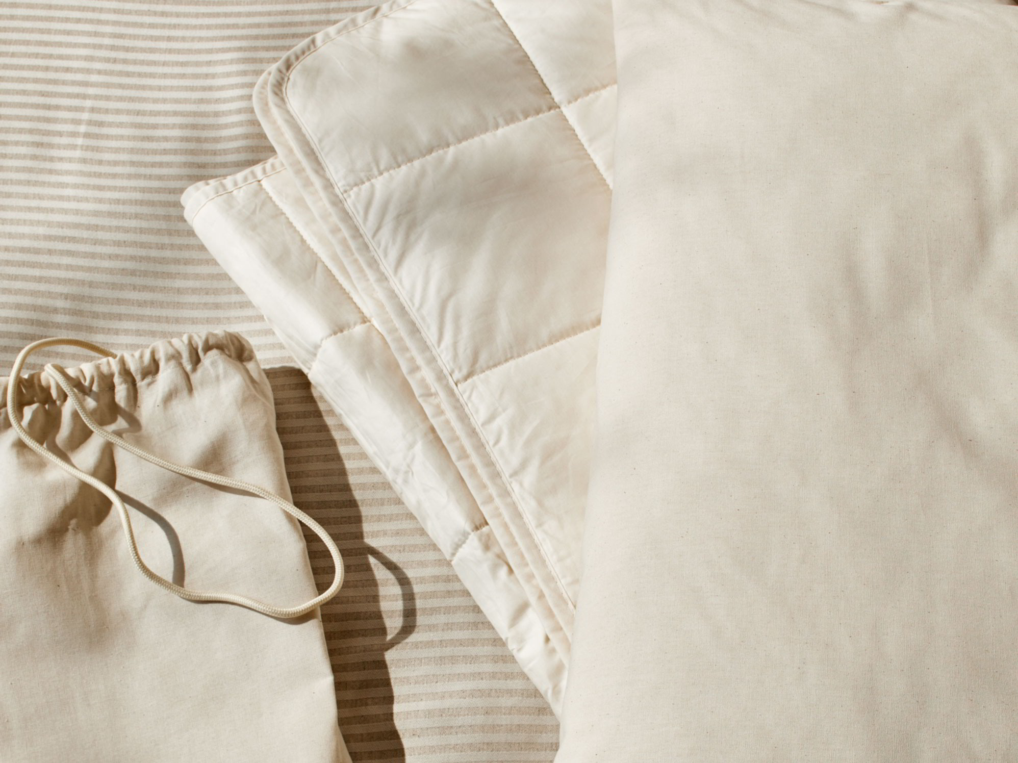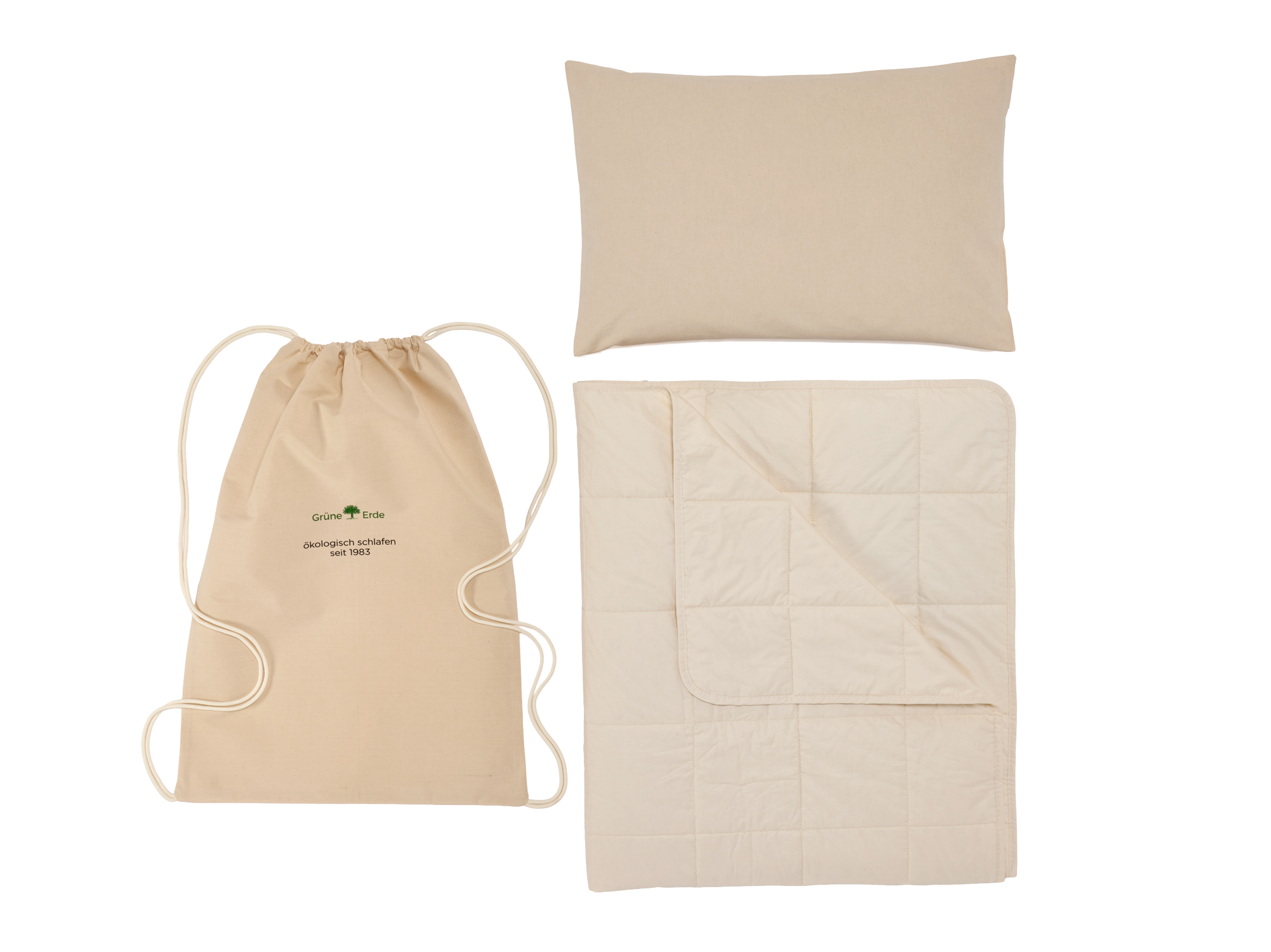 Reiseset Pur – Naturlatexkissen & Baumwolldecke im Tragebeutel