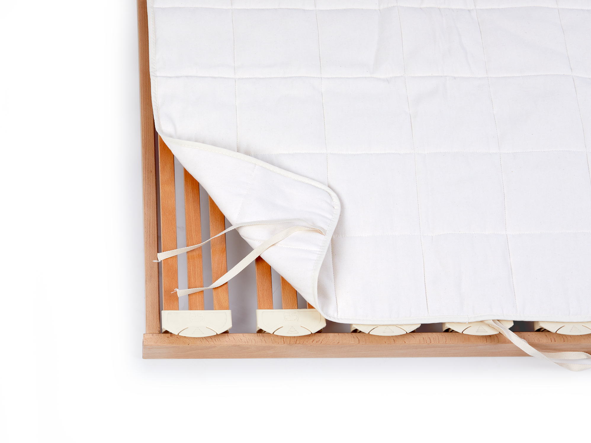 Lattenrostauflage – waschbar, luftdurchlässig, scheuerfestZu den gewohnten Vorzügen unserer Lattenrostauflagen – Luftdurchlässigkeit, Schutz der Matratze vor Reibung und Staub – kommt bei dieser Auflage hier eine wichtige Eigenschaft hinzu: Waschbarkeit! Dies erfüllt erhöhte Hygieneansprüche und verlängert die Lebensdauer der Auflage. Sie ist aus scheuerfestem Nesselfaser-Baumwoll-Vlies (250 g/m2) gefertigt und mit strapazierfähigem Baumwoll-Gewebe bezogen. Vlies und Bezug sind kassettenartig miteinander versteppt, um die Auflage beim Waschen in Form zu halten bzw. ein Verrutschen des Vlieses zu verhindern.Alle verarbeiteten Materialien sind luftdurchlässig und saugfähig, tragen daher zu einem stets trockenen Matratzenklima bei.Die Auflage wird mit 12 Bändern am Lattenrostrahmen befestigt, um ein lästiges Verrutschen beim Wenden der Matratze zu verhindern.Die bei 40° waschbare Lattenrostauflage ist auch für Veganer*innen, Tierhaar- und Milbenallergiker*innen gut geeignet.Für Doppelbetten sind zwei einzelne Auflagen vorgesehen.Füllung: 60 % Baumwolle, 40 % Nesselfaser. Baumwolle kbA aus Burkina Faso, Nesselfaser aus Deutschland.Bezug: 100 % Baumwolle. Baumwolle kbA aus Burkina FasoGefertigt in Deutschland, VEGAN-zertifiziert -