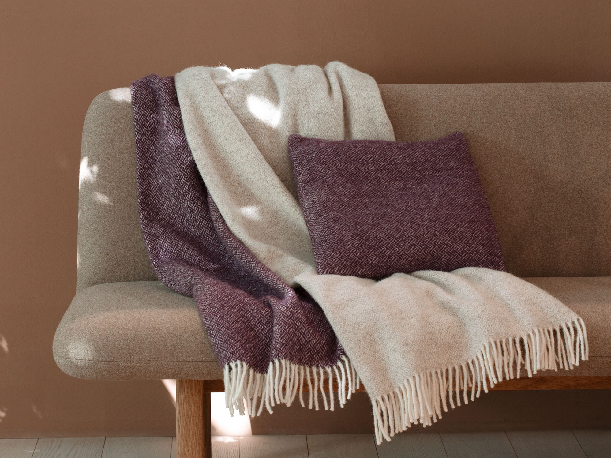 Die Wohndecke mit feiner, grafischer Dessinierung entsteht aus reiner, hochwertiger und mulesingfreier Schurwolle (Lamm) aus dem Eco Wool-Projekt. Geschoren werden die Lämmer erstmals, wenn sie sechs bis zwölf Monate alt sind. Die Wohndecke gilt als besonders wärmend, atmungsaktiv, pflegeleicht. Sie ist kernig im Griff und zeitlos in der Optik.
