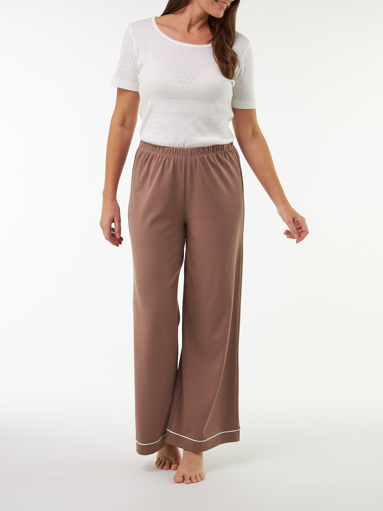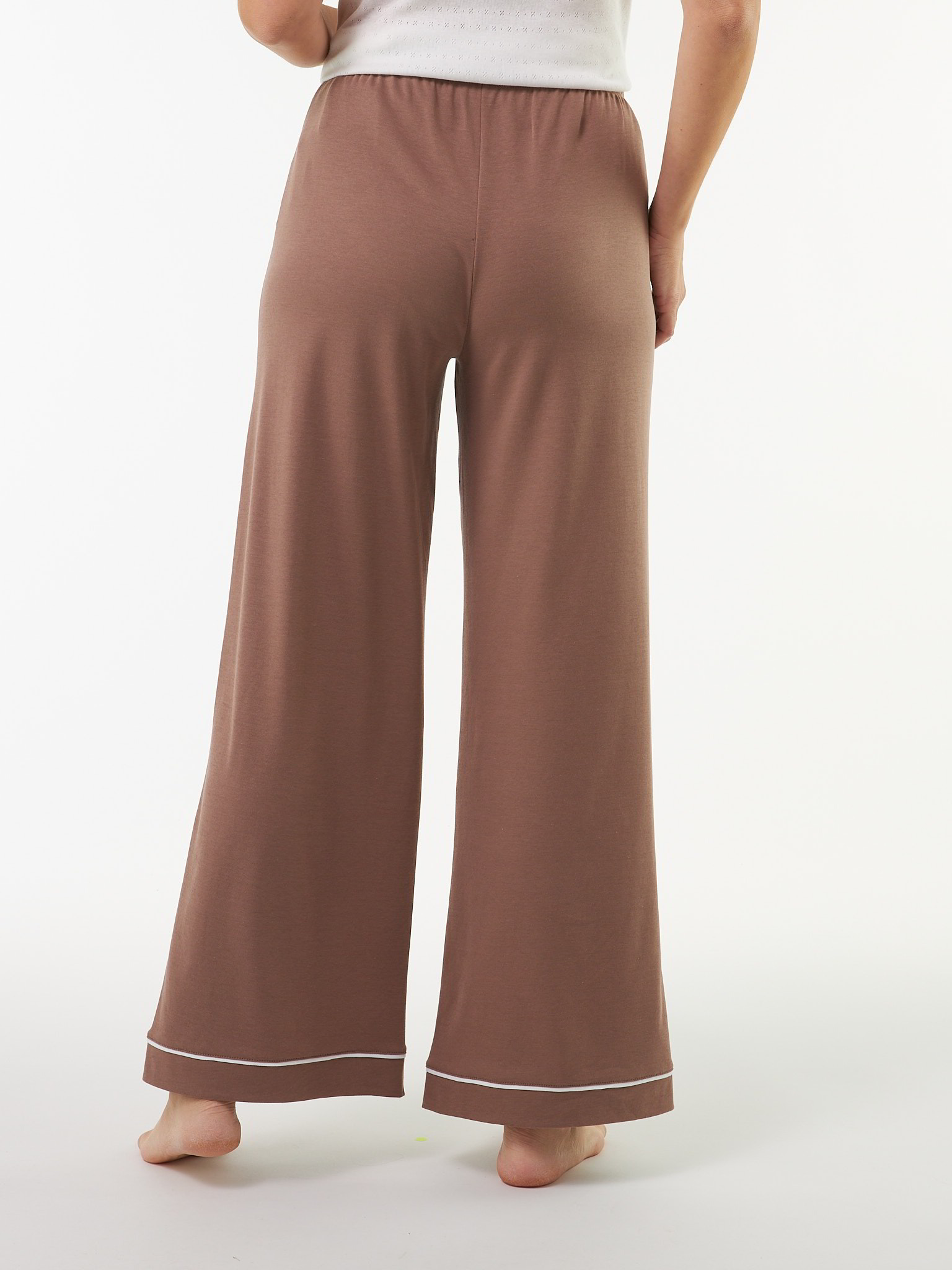 Lange Pyjama-Hose aus besonders weicher, hautfreundlicher Baumwolle kbA in feiner Jersey-Qualität. Der schmale Gummizug in der Taille sorgt für bequemen Sitz, während der weite, gerade Schnitt angenehme Bewegungsfreiheit schenkt. Eine kontrastfarbene Paspelierung am Beinsaum setzt einen dezenten, edlen Akzent. Ideal kombinierbar mit dem passenden Pyjama-Hemd – für rundum erholsame Nächte.