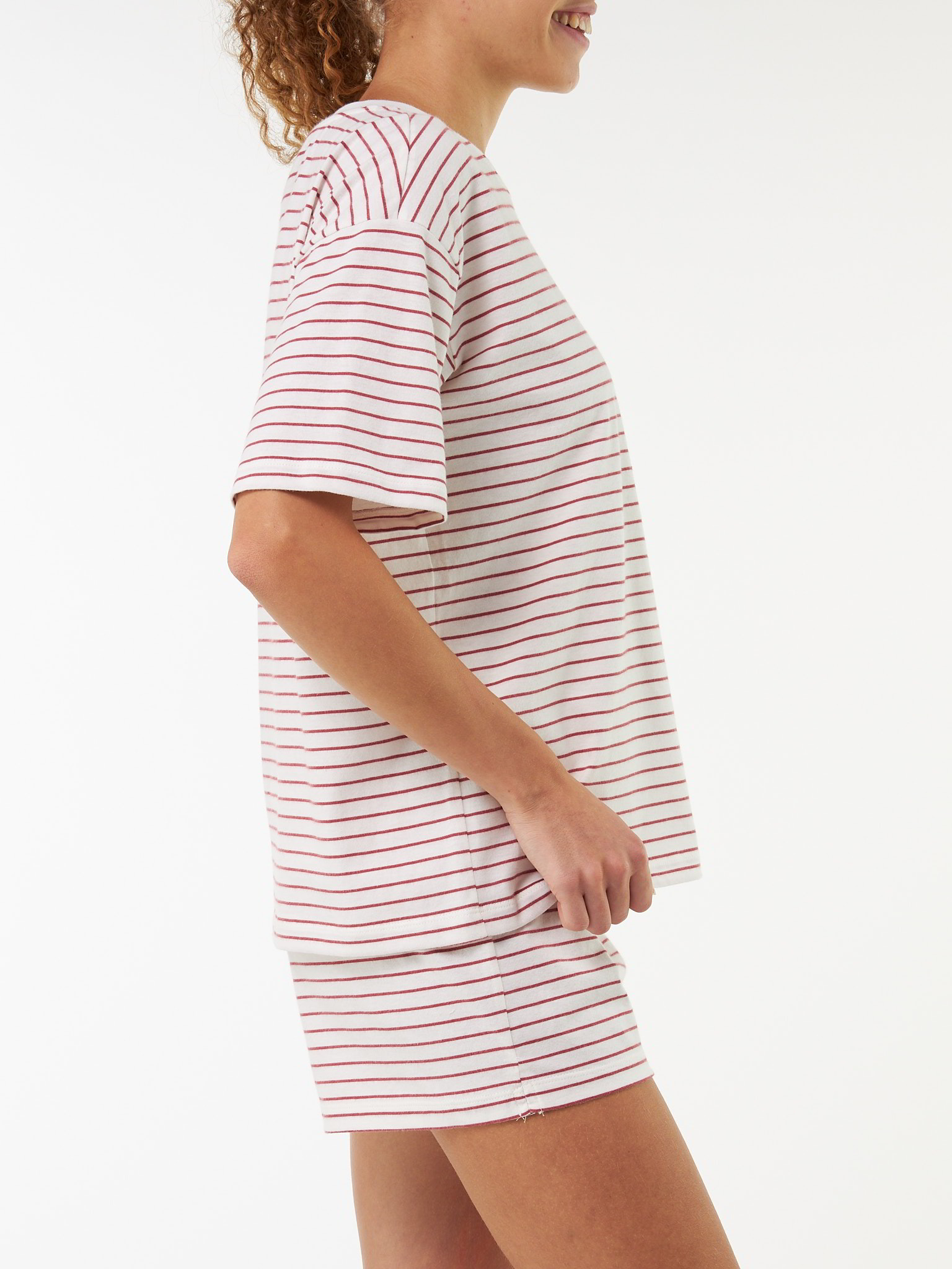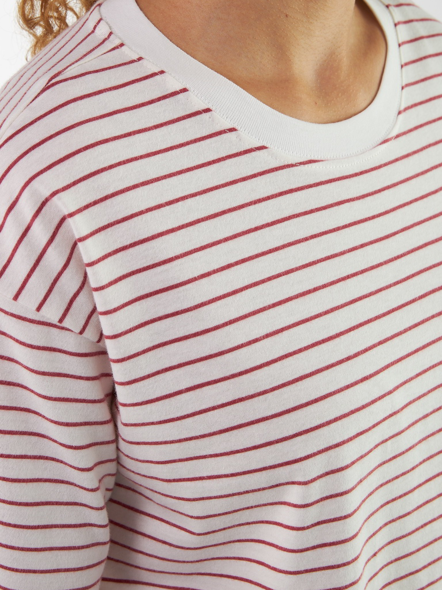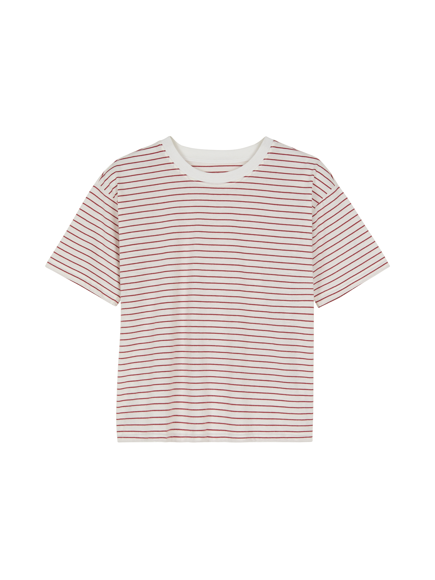 Das Kurzarm-Shirt mit zarten Streifen überzeugt durch weiche, atmungsaktive Baumwoll-Qualität und sorgt für ein angenehmes Tragegefühl – ideal für jeden Tag. Der legere Schnitt mit überschnittenen Schultern und kontrastfarbenem Rundhalsausschnitt verleiht dem Shirt eine moderne, entspannte Silhouette. Ein vielseitiges Basic, welches sich mühelos kombinieren lässt und den natürlichen Charakter der Serie unterstreicht.