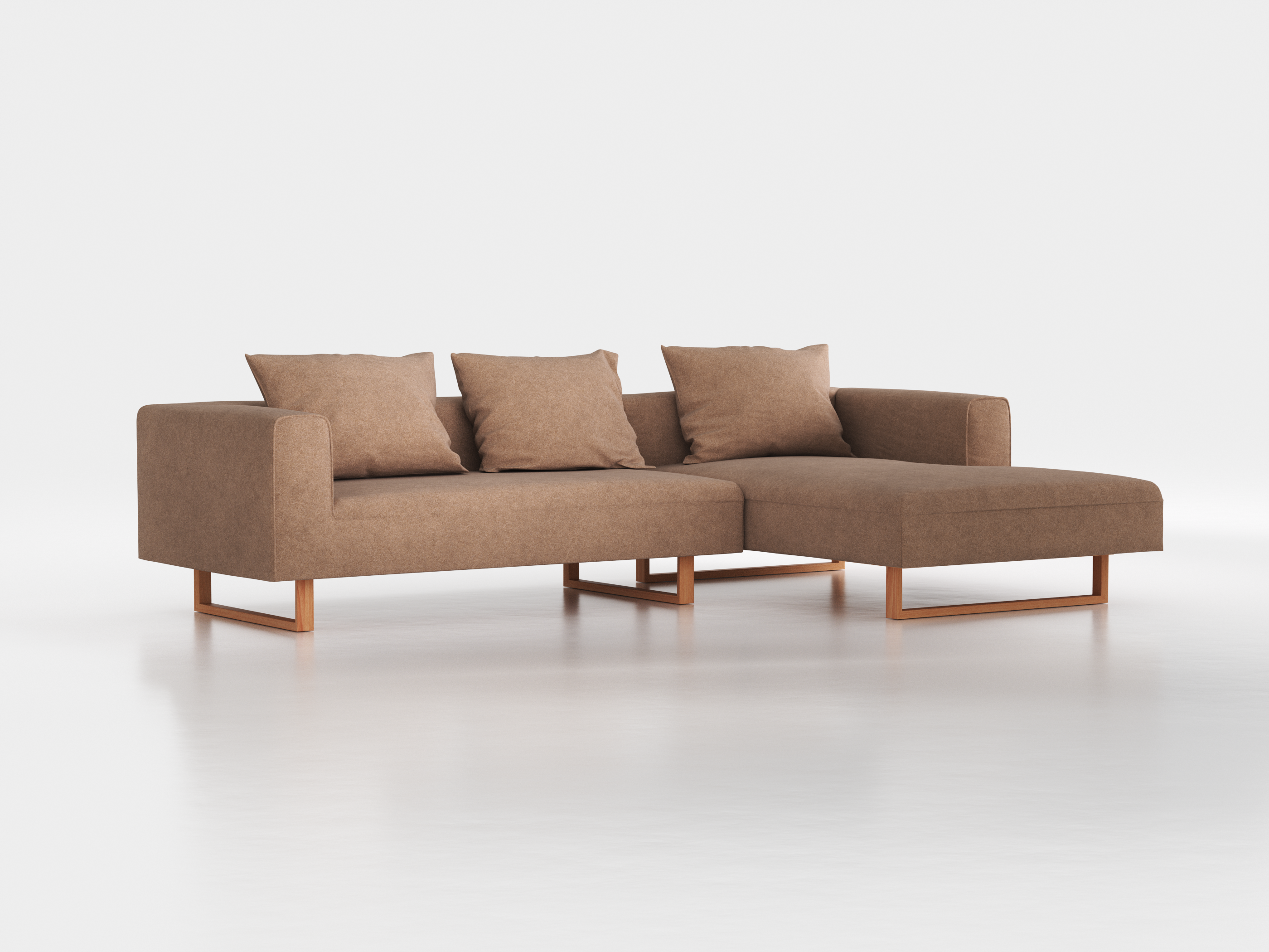 Lounge-Sofa Sereno inkl. 3 Kissen (70x55 cm), B 297 x T 180 cm, Liegeteil rechts, Bodennah, mit Bezug Wollstoff Elverum Haselnuss (74), Buche Grüne Erde <div><div><b>Viele Kombinationsmöglichkeiten</b></div><div>Sereno gewährt die Freiheit des Sitzens! Wenige Sofa-Elemente ermöglichen eine ... /media/Image/stripAndInterlace-legacy/.feIzD_vW/Image-53160/207474_imported.png 207474 207474