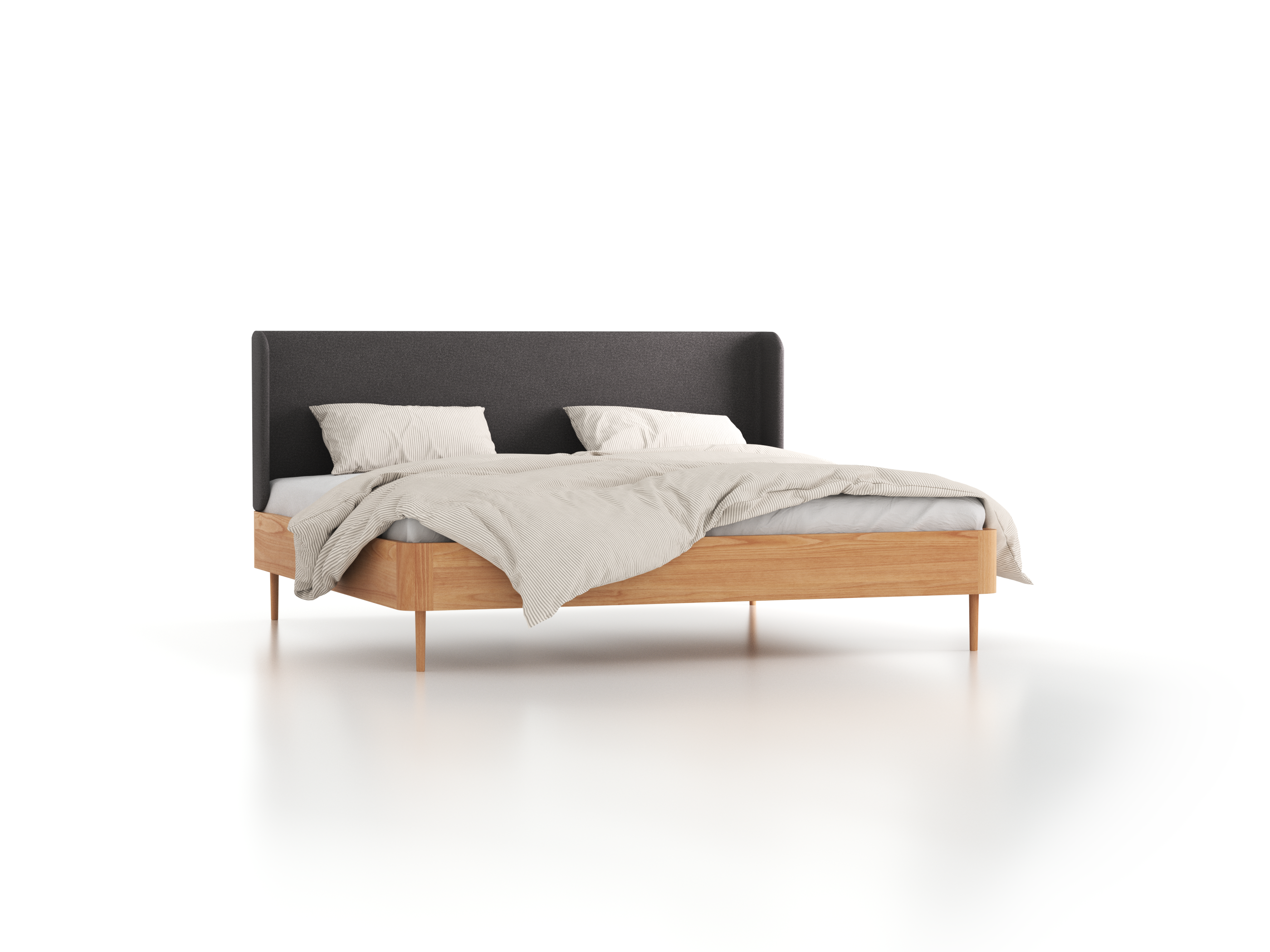 Bett Tonda mit Polsterbetthaupt, 200 x 200 cm, 19,5 cm, Wollstoff Stavang Schiefer (60), Buche
